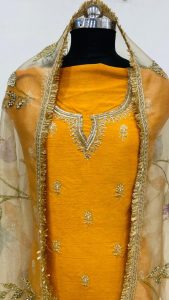 • Handwork Khadi Silk Fabric  Mustard Colour  Party wear suit