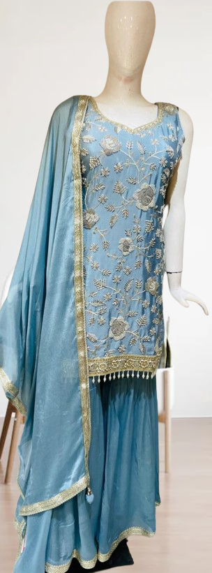 Chinnon Fabric Powder Blue Readymade Sharara Suit