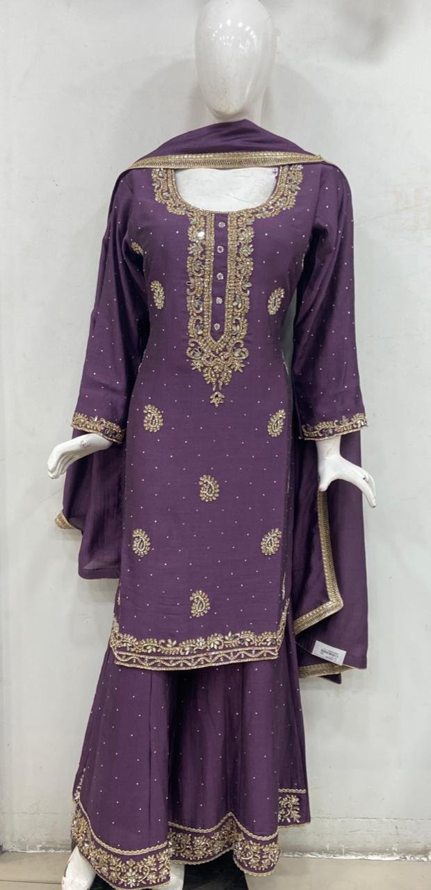 Chinnon Fabric Wine Colour Readymade party wear Plazo suit