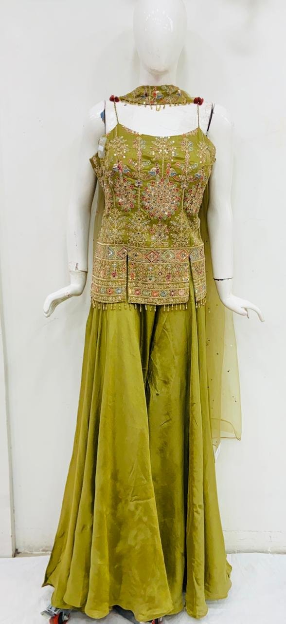 Chinon Fabric Mehandi Colour Thread work Readymade Plazzo Suit