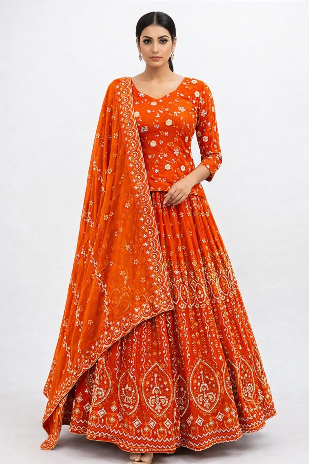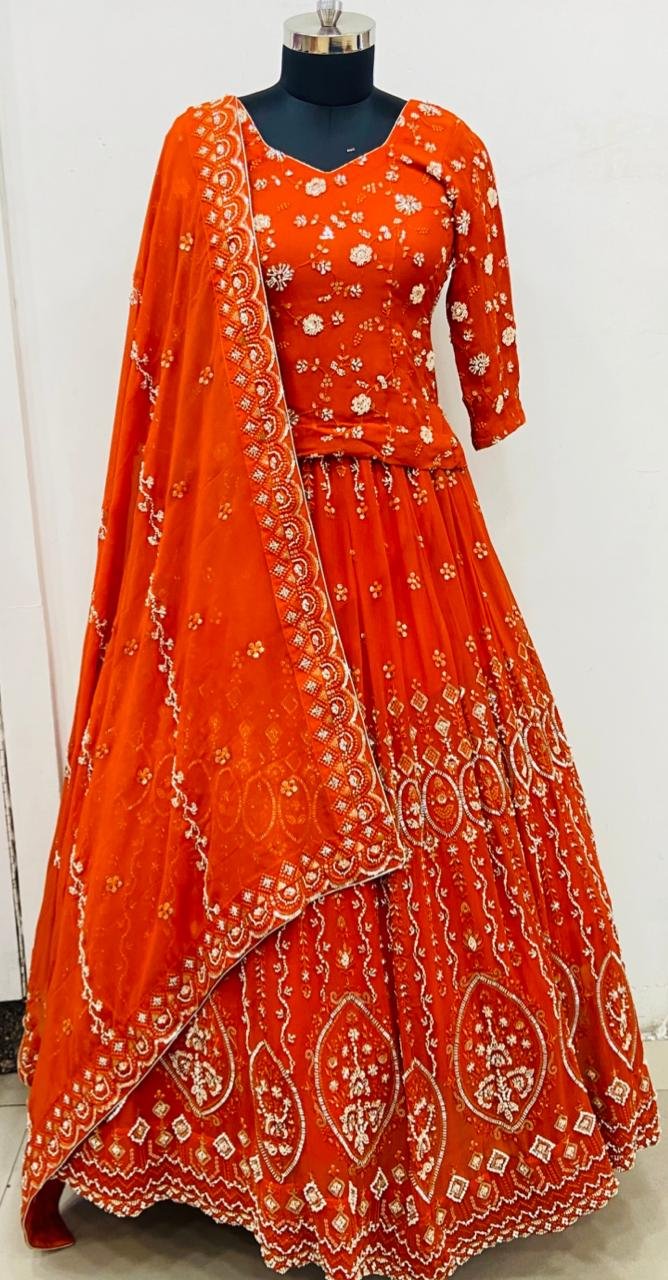 Georgette Fabric Rust Colour Customized Handwork Party Wear Dress
