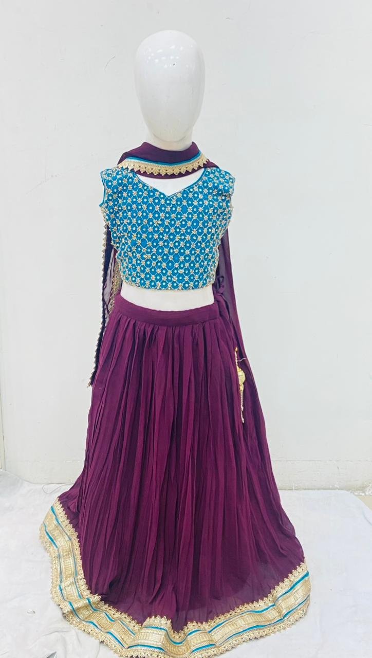 Georgette Fabric Wine and Firozi Contrast Party Wear Readymade Lehenga Choli