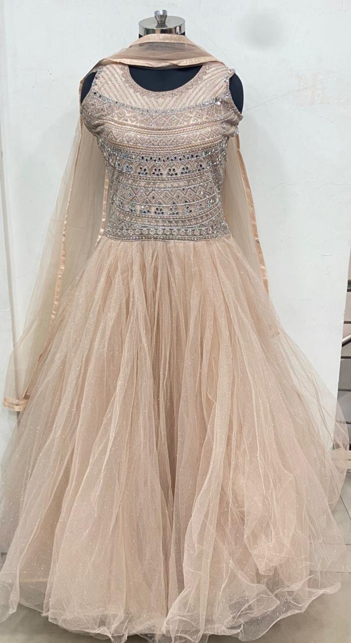 Net Fabric Handwork Light Peach Colour Readymade Gown