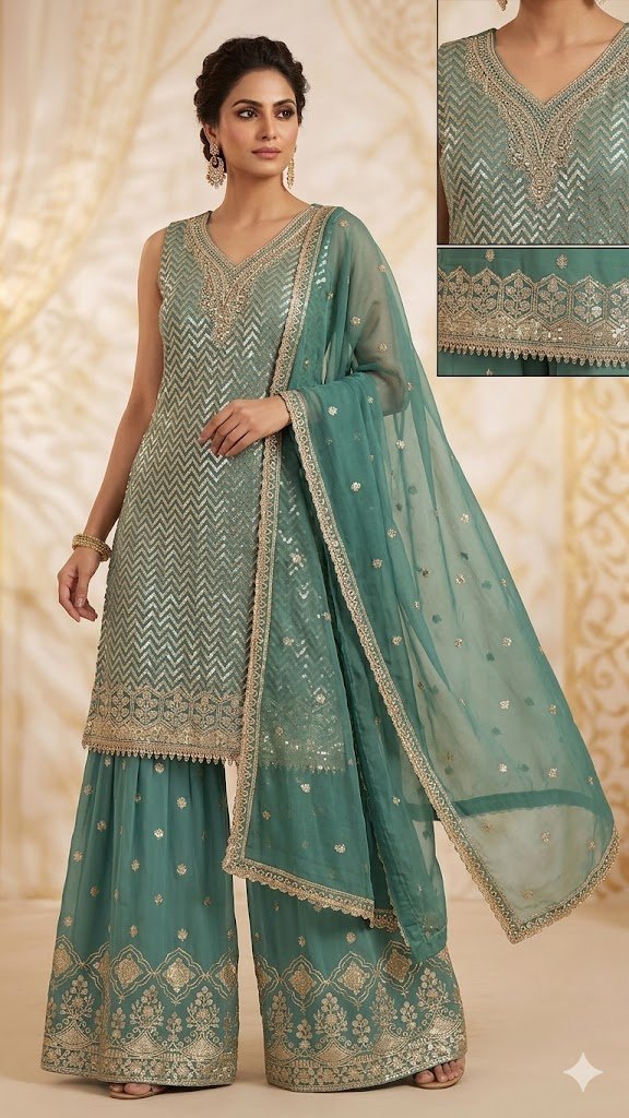 Readymade Plazo with kurti, Pista Colour, Georgette Fabric