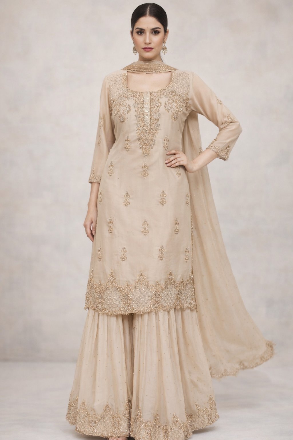 Shimmer Fabric Cream Colour Handwork Party Wear Readymade Sharara Suit