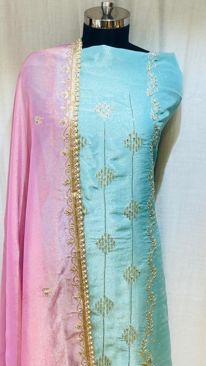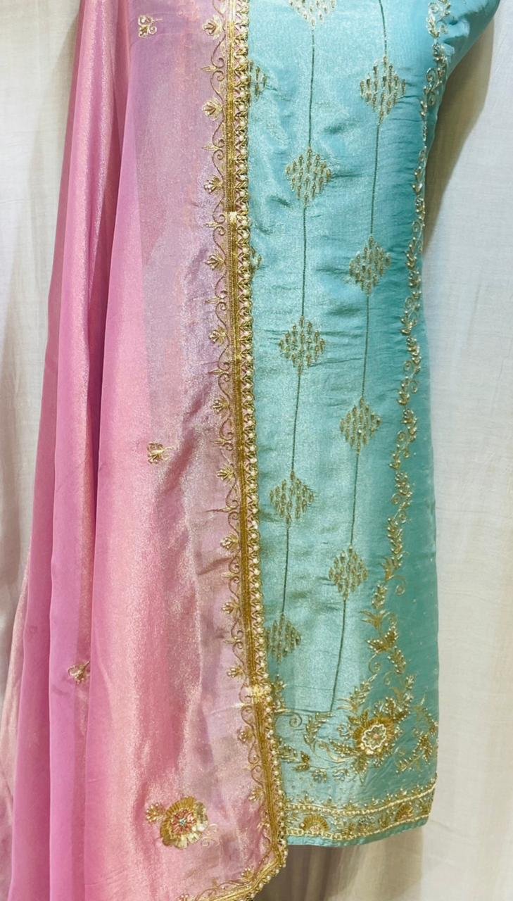 Shimmer Fabric Firozi Colour Handwork Party Wear Suit