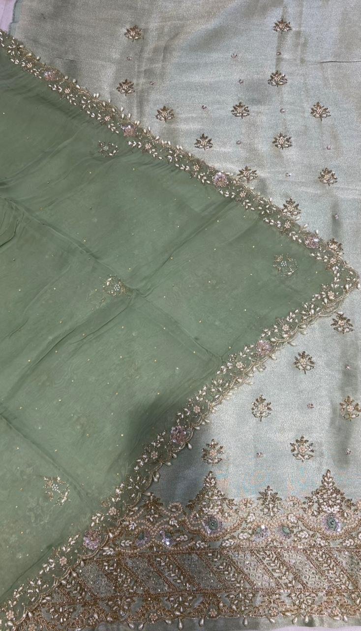 Shimmer Fabric pista colour with lovely hand work party work suit