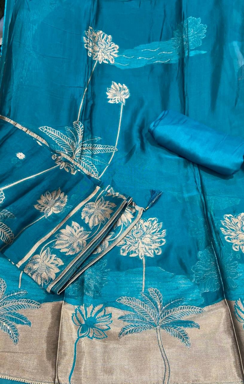 Silk Fabric Handwork Firozi Colour Designer Suit