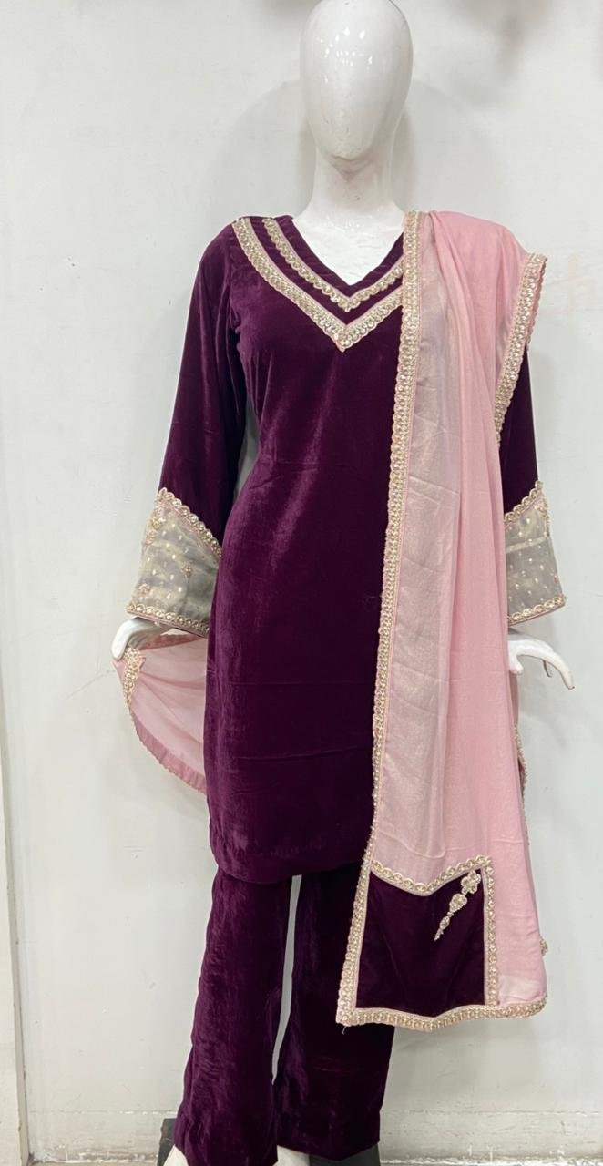 Wine Colour Velvet Fabric Customized Pant plazzo suit